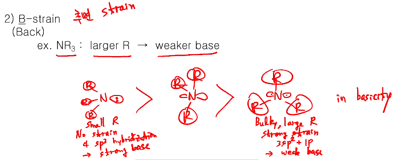 2)B-strain: B(back) 후면스트레인이다. 전면 스트레인처럼 치환기가 크면 염기도가 떨어지는데 .... NR3에서 알킬기 R이 커질수록 약산이 된다. 위 예시에서 에틸기가대신 벌크하지 않은 H가 있을 때도 R이 커지면 약염기가 된다.