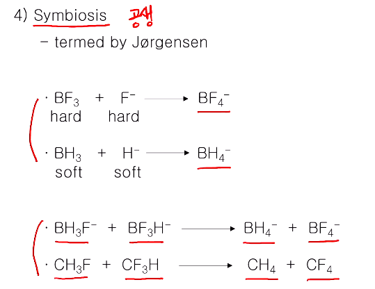 심바이오스(공생)은 예를 통해서 보자~ BF3는 하드한 애시드다 F-를 만나면 하드끼리라서 잘 반응하고, BH3는 소프트라서 프로톤과 잘 반응한다. 즉, F, H 끼리 같은 것끼리 모인다는 뜻으로 symbiosis라고 썼다. 만일 이 둘이 섞인 것을 서로 반응 시키면 같은 것끼리 모이는 형태로 정리된다. 이것만큼 드라마틱 하게 반응 잘 일어나지는 않지만 메테인 화합물에서 H,F가 섞인 것 또한 고온 레디컬 반응 등으로 합치면 H는 H끼리, F는 F끼리 모인다. 이것도 일종의 하드 소프트 개념을 잘 쓴 것이다. 화학에서 심바이오시스는 같은 화학성분끼리 모이는 것이 마지막 하드 소프트의 예이다.
