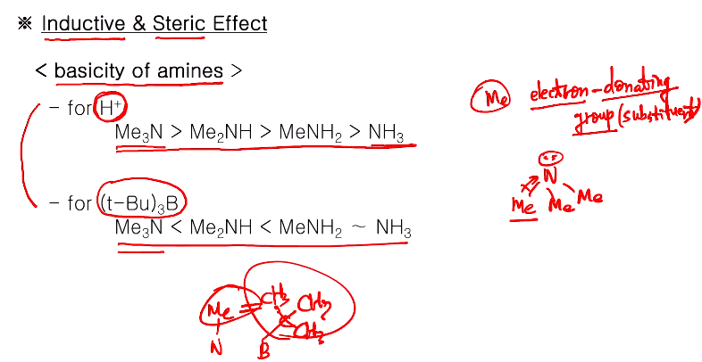 조금 전 입체효과를 얘기했는데 입체효과 말고 유발효과도 같이 고려가 되어야 한다. 서로 상충되는 경우가 있는데 어느 게 더 중요하게 기여하냐 따라서 염기도가 달라진다. 알킬 아민들의 염기도에서 비교할 때 입체장애가 거의 일어나지 않는 수소인과 트라이 터셔리 부틸 보론은 아주 벌퀴한 치환기로 알킬 아민과 입체장애가 심할 것이다. (F-strain) 아민의 염기 순서도가 바뀌는데 위 두 개를 비교하는 것은 입체효과에 따라 달라지는 것이고, 수소이온에서는 입체효과가 거의 없으므로 메틸기가 있을수록 염기도가 증가한다! B-strain으로 봤을 때 염기도가 오히려 떨어져야하는거 아닌가? 하지만 메틸은 가장 작은 치환기로 입체장애가 거의 없다. 메틸기는 전자 주개 그룹(치환기)으로 유도효과에 의해 메틸기가 많이 있을수록 전자를 N에 주므로(위 그림) 중심원자에 있는 비결합 전자쌍이 풍부해지고 제공하기 쉬워진다. 그래서 메틸기는 입체효과를 나타낼 만큼 큰 R은 아니고, 전자 주개 그룹이기 때문 많을수록 염기도가 증가한다. 입체효과가 전혀 나타나지 않는 H와는 이랬지만 벌퀴한 보론의 터셔리 뷰틸기에서는 어떻게 되는가? 작은 메틸기라고 해도 전면 입체효과(F-strain)이 생겨서 염기도 순서가 수소 이온과 반대로 된다.