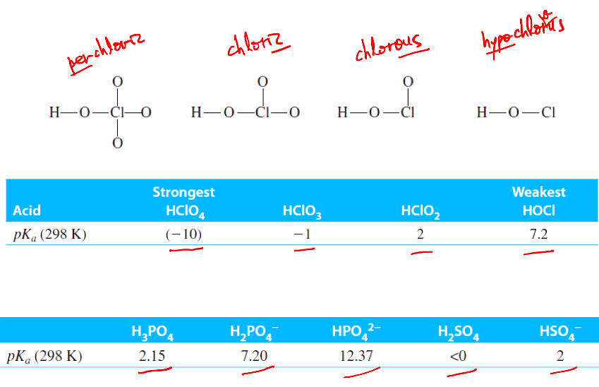 표에 4가지 과염소산(perchloric acid)들이 나와 있다. 염소산은 chloric acid, 아염소산은 chlorous aicd, 차아 염소산(하이퍼 염소산) hyperchlorous acid이다. 이들의 산도가 과염소산이 가장 강한 pK가 -10이고 하이퍼염소산은 7.2로 약하다. 인산은 약산이라기도 어렵고,,, 중간산으로 아 염소산과 유사한 2.15값 갖는다. 인산은 삼양성자산이고 수소가 떨어져 나갈 때마다 약해진다. 황산은 강산으로 pK가 -값을 갖고 두 번째 H가 떨어져 나올 때 인산이나 아염소산과 유사한 pK값을 갖는다.