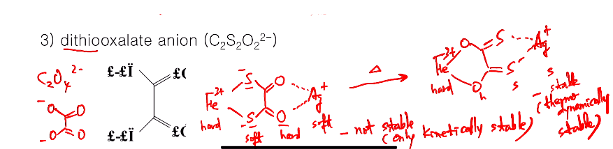 세 번째 예는결합자리가 두 종류 있는 형태인데, PDF가 깨져서 이상하게 나와있는데 원래는 위와 같다. (원래 PDF와 다른데 결합자리가 두 개?라서 둘 다 되는가?) 옥살레이트이온은 C2O42-이고, 모두가 O인 것인데 dithio는 S로 치환된 폼이다. 이게 메탈과 결합하면 sulfer는 소프트, O는 하드한 쪽으로 결합한다. 만일 어떤 반응을 통해서 Fe2+, Ag+착화합물을 만들면 철은 하드하지만 소프트한 설퍼에, 실버는 소프트하지만 하드한 산소로 결합된다면 안정하지 않다. 어떤 반응에 의해서 반응속도론적으로 안정돼서 반응된다 하더라도 단지 반응속도론적으로만 안정하고 이 상태에서 약간의 자극(가열) 하면 안정한 상태로 돌아간다. 안정한 상태란 하드-하드, 소프트-소프트로 결합한다. 그래서 철과 산소가 결합하고 황쪽에 실버가 결합하면 안정하다. 이때는 열역학으로 안정하다!