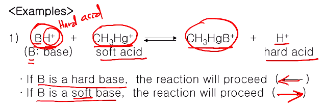 B는 염기를 다 총칭해서 쓰는것! 메틸 머큐리(소프트 산)과 반응할 때 염기(B)가 하드, 소프트에 따라 역반응 정반응이 정해진다. 여기에 BH+가 CH3Hg+를 만나면 H+는 하드 acid이고, CH3Hg+이건 소프트 산이다. 그래서 B가 하드 염기면 H+와 잘결합할 것이고 소프트 염기면 CH3Hg+와 결합을 잘 할 것이다. 하드 베이스면 BH+가 잘 만들어지는 역반응이 유리하고, 베이스가 소프트하면 CH3HgB+ 가 잘만들어지는 정반응이 유리하다. BH+ + CH3Hg+각각 하드와 소프트에 대해서 베이스 B에 따라 진행되는 반응 방향이 정, 역 반응이 정해진다.
