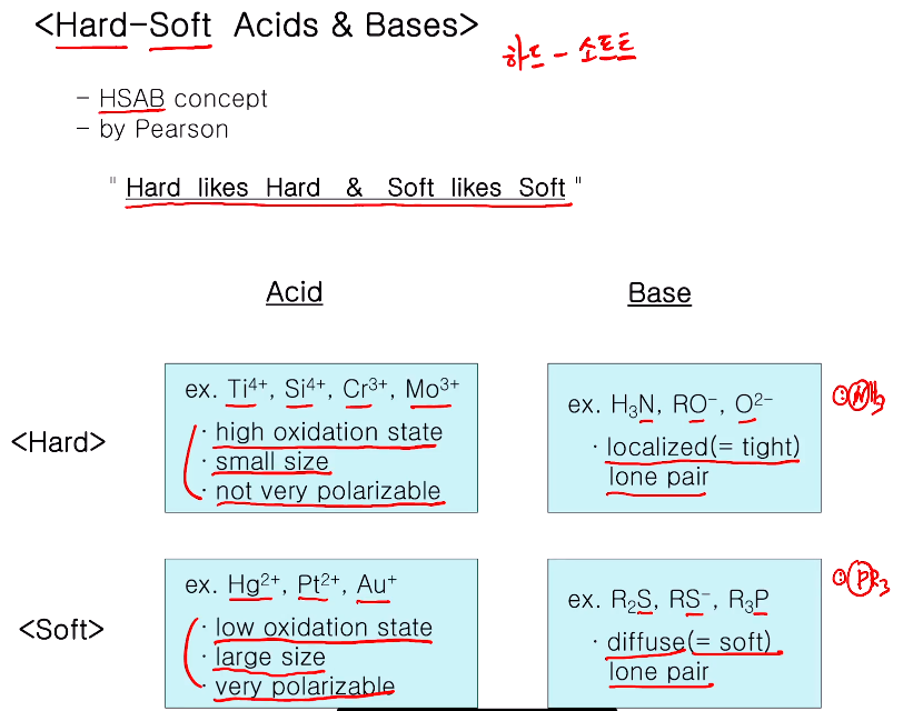 - 베이스 3주기 이후 원소가 중심 원자인 리간드 화합물인 경우 소프트하다.