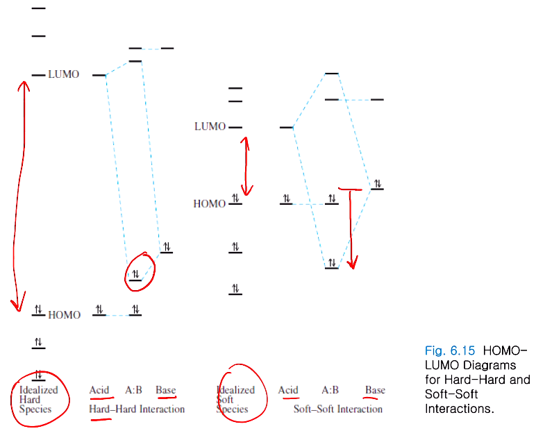 하드끼리는 자기들끼리 idealized hard species! 하드는 HOMO LUMO 에너지 간격이 크므로 하드 산 염기가 결합하면 오버랩을 약간한다고 되어있지만 거의 무시할 수준이다. 하드끼리 만나서 오버랩을 한다면 오버랩이 거의 안돼서 이온결합 형태가 일어나고 소프트한 것들은 HOMO LUMO 에너지 간격이 작아 서로 오버랩을 잘 해서 안정화된다. 소프트끼리는 공유결합 성격으로 오버랩을 잘해서 공유결합이 잘 일어나는 반면, 하드끼리는 이온결합적인 성격이 강해서 이온결합끼리 서로 강해진다. 공유결합적인 성격으로 오버랩이 안돼서 안정화되지 않는다. 하드와 소프트가 만나면 하나는 이온결합을, 하나는 공유결합을 하려고 해서 서로 좋아하는 게 다르다. 극성은 극성끼리, 비극성은 용매용질끼리 잘 만나녹고... 비극성 극성은 서로 잘 안 섞이듯,,, 소프트와 하드가 만나면 잘 결합을 안 한다.