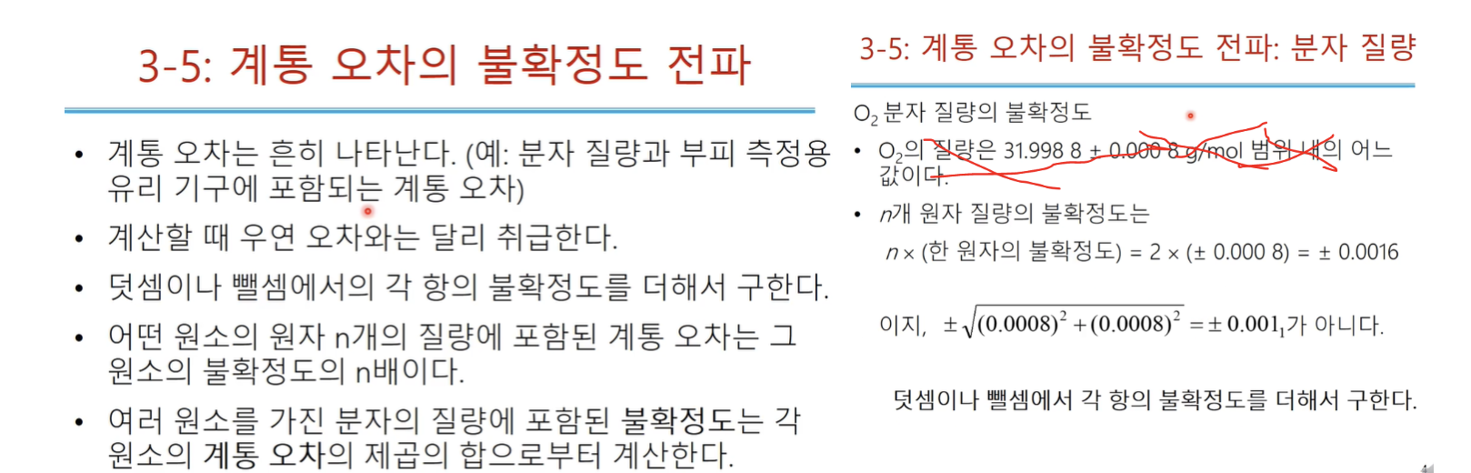 계통오차 중에서 눈여겨볼 것은 분자 질량에 관한 것인데, 같은 원소로 된 O2, N3등 질량에 포함된 계통오차는 각 원소들의 불확정도의 n배로 계산을 합니다. O2 같으면 산소 원자량 불확정도의 2배. 주기율표 보면 +-로 불확정도가 나와있는데 그것은 계통오차를 나타냅니다. 계통오차는 원소의 원자량을 나타날 때 평균 원자량이고, 그 원자량은 동위원소를 고려한 원자량이라.... 동위 원소란 원소끼리 각각의 원자량이 다르고, 이 평균값을 낸 게 대표값이라서 +- 불확정도가 생긴다. 이렇게 원인을 알고 있기에 계통오차라고 한다. 종류가 다른 원소 NO, CO의 경우의 불확정도는 각각의 불확정도는 우연오차로 취급하여 계산합니다.( 루트 제곱 등..)