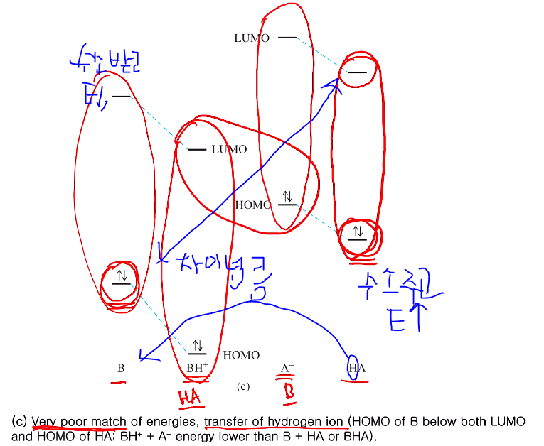 심한 경우에는 위의 그림과 같이 HA의 호모 루모가 가장 오른쪽이고 B의 호모가 가장 왼쪽에 있다. HA의 호모가 B의 호모보다 더 에너지가 높다. B 호모와 HA 루모 사이의 인터렉션이 일어나야 하는데 B의 호모보다 HA가 오히려 에너지가 높으면 둘 사이 인터렉션이 일어날 수 없고,,, 오히려 B가 수소를 받아서 전체적으로 호모루모를 낮추고, HA가 B에 수소를 줘버리면 A-가 되고 호모루모는 더 올라간다. 그래서 BH+, A-둘 사이에서 인터렉션이 일어난다. BH+가 HA가 되는 것이고 A-가 B가 돼서 서로 수소 결합이 일어난 케이스이다. 원래 HA,B로 하면 B의 호모보다 HA가 오히려 에너지가 높으면 둘 사이 인터렉션이 일어날 수 없으므로 수소이온의 transfer가 일어나서 산염기가 서로 바뀐 BH+가 HA가 되는 것이고 A-가 B가 돼서 서로 수소 결합이 일어난다. 아주 very poor하다