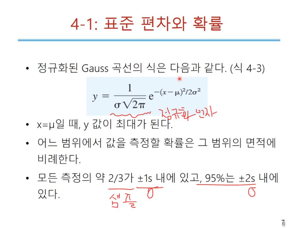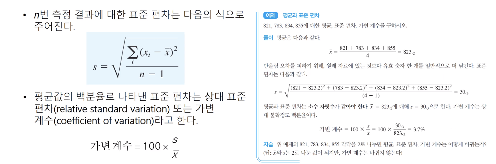 정리! n이 아닌 n-1이 들어가는 것은 샘플의 표준편차를 더 크게 잡아서 범위를 더 넓게 잡고 그 안에 모평균이 들어있을 확률이 얼마라고 말하기 위함이다. xi는 1회 측정값이고, x 바는 n 번 측정했을 때 측정값 평균이다. 표준편차를 백분율로 나타내는 것이 상대 표준편차이다. (표준편차 / 평균 x 100)