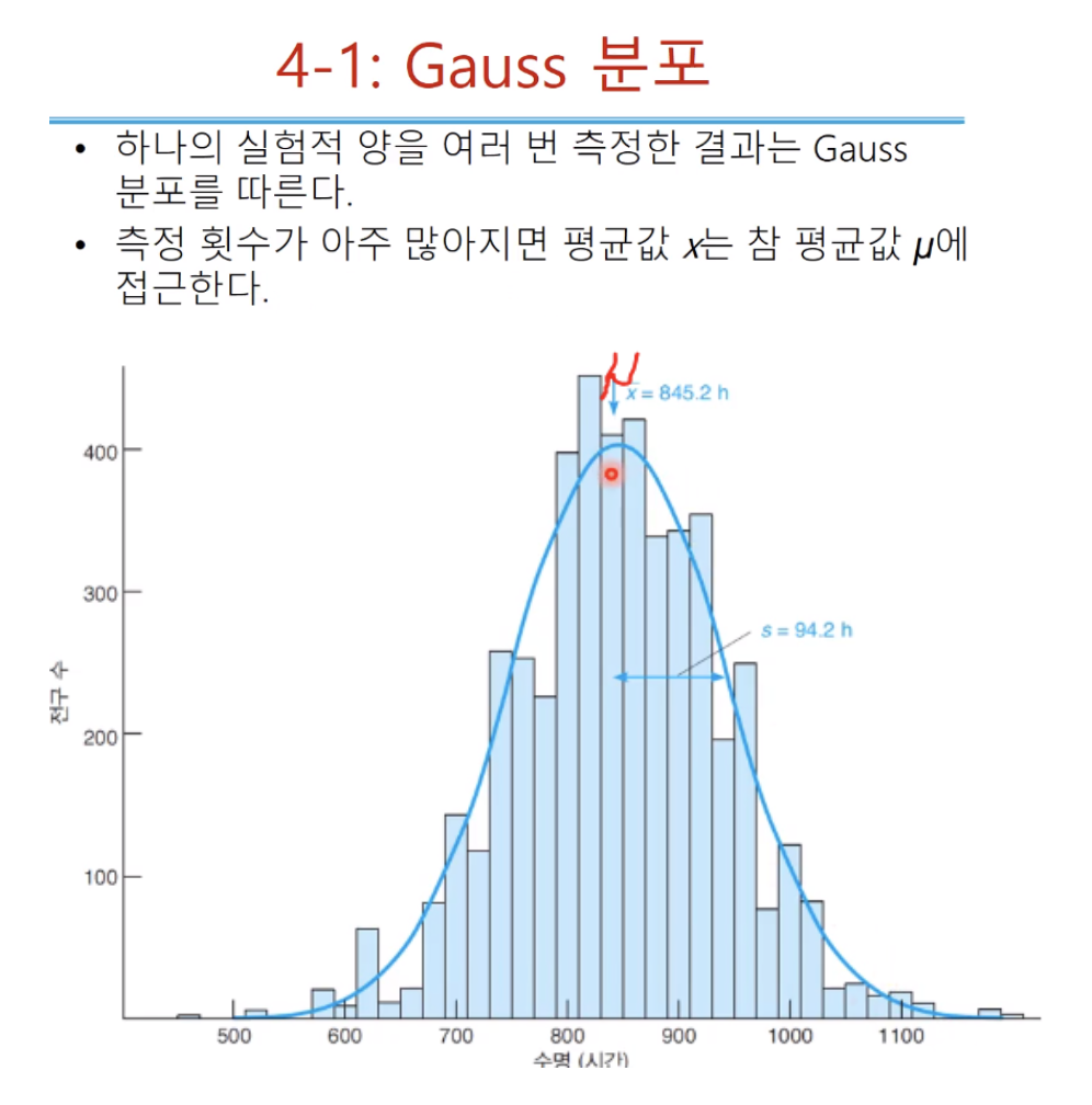 모집단의 샘플 표준편차, 샘플의 표준편차를 안다고 가정하고 지금은 샘플 표준편차에 대한 얘기 하는 중! n 번의 측정 결과는 n 개의 샘플을 취해서 하나씩 측정하는 것은 n 번의 측정 결과가 나온다! 샘플의 하나를 취해 n 번 측정하는 것! 위와 같이 식이 나온다. 보통 평균은 측정값과 모두 더한 뒤 n으로 나눈다! 산술평균으로! 여기서는 n-1을 사용했다. 표준편차는 측정값이 평균으로부터 얼마나 멀리 떨어지는 보여주는 척도인데~ n을 쓰면 분모가 크니 전체 값이 줄어드는 것! 즉 표준편차가 작아진다.