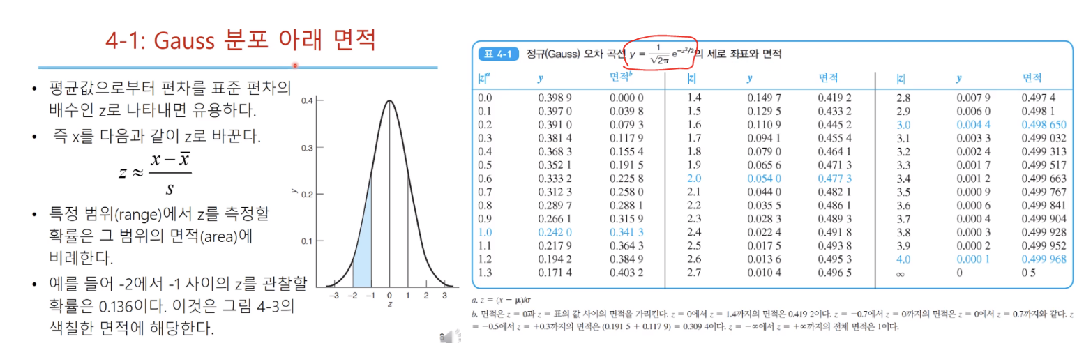 봉우리로부터 양의 방향으로 무한대일 경우 면적은 총 1의 반이 되니 0.5이다. 면적이 확률이다!!! z 값을 도입해서 앞에서 주어졌던 정규분포에 대한 식을 변형하게 되면 위 테이블 동그라미처럼 조금 더 간단해진다. 다른 말로 정규 오차곡선이라고 부른다. 테이블의 이런 값들은 위 식을 정적분해서 나온 것이다.