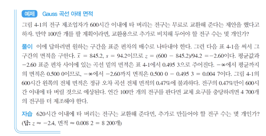 아까 전구에서 막대그래프 무시하고 선으로 된 종 모양의 가우스 분포함 수로 생각하고, 정규분포라 가정하자. 평균 수명이 845.2 시간으로 샘플의 평균인 x 바를 썼지만 엄격히 얘기하면 모집단의 평균이라고 얘기해야 한다. 이런 문제를 풀 때 가정을 해야 하는데, 정규분포 곡선은 모집단에 의해서 얻어진 것이긴 하지만 그것을 활용하여 면적이나 확률을 구할 때 샘플의 데이터를 활용한다는 것으로 이런 문제점을 잘 이해해야 한다. 샘플의 평균과 표준편차 값은 위 풀이와 같고 z 값은 -2.60이 나오고 표를 통해 면적(0.495 3)을 구하면 된다. 600시간 이내 타버리는 전구는 845.2 시간보다 한참 낮은 곳의 시간이다. 600시간 이내 타버리는 전구의 비율을 구하는 게 목적이니 600시간 보다 낮은 부분의 해당되는 곳은 0.5- 0.495 3 = 0.004 7에 해당하는 지역이다. 판매할 때 교환해야 할 0.47% 해당하는 4 700개를 만들어 구비하고 장사하면 좋을 것 같다.